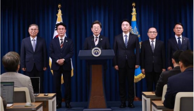 ▲이재명 대통령이 4일 서울 용산 대통령실 청사에서 열린 새 정부 첫 인사 발표를 하고 있다. 왼쪽부터 이종석 국가정보원장 후보자, 김민석 국무총리 후보자, 이 대통령, 강훈식 대통령비서실장, 위성락 안보실장, 황인권 대통령경호처장.