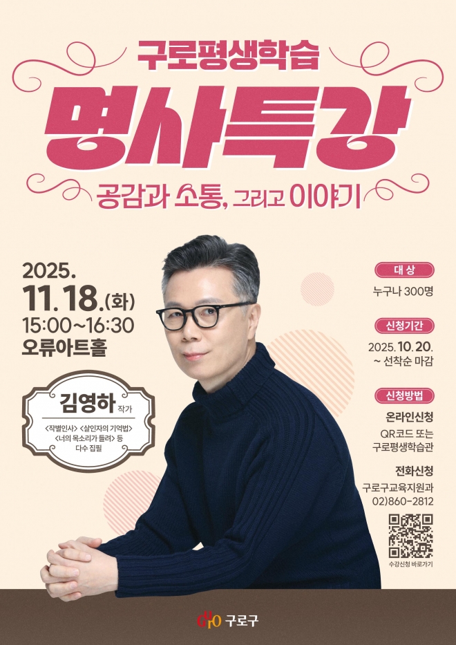 수강 신청은 10월 20일부터 선착순으로 접수하며, 구로평생학습관 누리집 또는 큐알(QR)코드, 전화(02-860-2812)를 통해 신청할 수 있다.