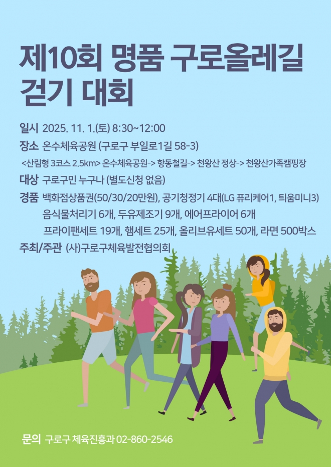사단법인 구로구체육발전협의회(회장 김홍수)가 주최, 주관하고 구로구가 후원하는 ‘제10회 명품 구로올레길 걷기 대회’가 11월 1일 오전 8시 30분 온수체육공원에서 열린다.
