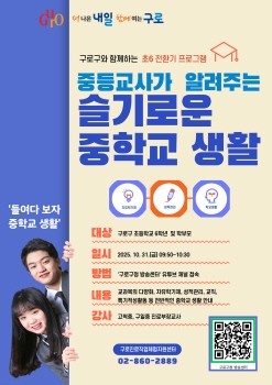 중학교 입학 앞둔 초등 6학년 대상 실시간 온라인 방송 진로교사 참여, 생생한 현장 경험 전달·질의응답 진행   구로구가 10월 31일 초등학교 6학년 학생과 학부모를 대상으로 중학교 입학 전 알아야 할 주요 정보를 안내하는 ‘슬기로운 중학교 생활’ 프로그램을 유튜브 생방송으로 운영한다.   이 프로그램은 중학교 입학을 앞둔 학생과 학부모가 겪는 막연한 불안과 궁금증을 해소하고 입학 전 필요한 정보를 미리 습득할 수 있도록 마련됐다. 자유학기제, 교과목 구성, 성적 평가 방식 등 실질적인 중학교 생활 전반을 알기 쉽게 소개한다. 방송은 10월 31일 오전 9시 50분부터 40분간 구로구청방송센터 유튜브 채널을 통해 실시간 송출된다.   강의는 고척중학교 남연호 진로교사와 구일중학교 황정희 진로교사가 맡아 교육 현장의 생생한 경험과 실질적인 조언을 전달한다. 별도의 신청 절차 없이 누구나 시청 가능하며, 방송 시간에 맞춰 유튜브 채널에 접속하면 된다. 방송 종료 후에는 2026년 2월 28일까지 녹화본 시청도 가능하다. 실시간 질의응답 시간도 마련돼 궁금한 점을 바로 질문하고 답변받을 수 있다.   자세한 내용은 구청 진로진학팀(02-860-2889)으로 문의하거나 구로구청 누리집에서 확인할 수 있다. 장인홍 구청장은 “중학교 입학을 앞둔 학생과 학부모에게 꼭 필요한 정보를 알차게 담았다”며 “이번 프로그램을 통해 더 많은 학생들이 자신감을 갖고 중학교 생활을 시작하길 바란다”고 말했다.    <이성용 기자>     |