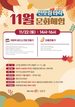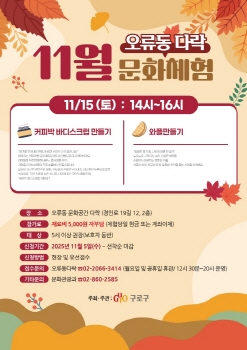 매주 토요일 영화 상영, 커피박 바디스크럽 만들기-와플 만들기 11월 5일부터 체험 프로그램 선착순 접수…5세 이상 참여 가능   구로구가 오는 11월 한 달 동안 신도림과 오류동 ‘문화공간 다락(多樂)’에서 다양한 문화 프로그램을 운영한다. 구는 다가오는 겨울을 맞아 주민들이 따뜻한 겨울 분위기를 즐길 수 있도록 매주 토요일마다 신도림과 오류동 문화공간 다락에 영화 상영 및 체험 프로그램을 진행한다고 밝혔다.   신도림 다락에서는 △인사이드 아웃(11월 1일) △비긴 어게인(11월 8일) △그 여자 작사 그 남자 작곡(11월 15일) △로마의 휴일(11월 29일)을, 오류동 다락에서는 △리틀 포레스트(11월 1일) △스즈메의 문단속(11월 8일) △버킷리스트(11월 22일) △시간 여행자의 아내(11월 29일)를 상영해 가족 단위 주민들이 함께 즐길 수 있는 작품을 선보인다.   또한, 신도림 다락(11월 22일)과 오류동 다락(11월 15일)에서 각각 ‘커피박 바디스크럽 만들기’와 ‘와플 만들기’ 체험 프로그램이 진행된다. 체험 프로그램 참여를 원하는 경우 오는 11월 5일부터 다락에 방문하거나 전화를 통해 신청할 수 있으며, 선착순으로 마감된다. 5세 이상부터 참여할 수 있으며, 재료비는 5,000원이다.   기타 자세한 사항은 구청 문화관광과나 다락으로 문의하면 된다. 아울러 11월 중순부터는 산타와 크리스마스 트리, 조명 등으로 따뜻한 겨울 분위기를 연출하고 주민들이 사진을 찍으며 추억을 남길 수 있도록 포토존도 함께 조성할 예정이다.   장인홍 구청장은 “문화공간 다락은 주민들이 가까운 곳에서 여유롭게 문화를 향유할 수 있는 공간”이라며 “앞으로도 계절에 어울리는 다채로운 프로그램을 운영해 주민들의 일상에 활력을 더하겠다”고 말했다.   문의) 구로구청 문화관광과 02-860-2585 신도림 다락(새말로 121-15, 2층) 02-861-3414 오류동 다락(경인로19길 12, 2층) 02-2066-3414     <이성용 기자>       |
