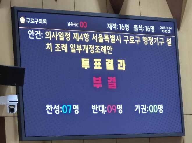 ▲내년 1월부터 구로구청 복지지원국 산하 ‘통합돌봄과’ 신설과 관련 △서울시 구로구 행정기구 설치 조례 일부개정안과 △서울시 구로구 지방공무원 정원 조례 일부개정안 2건은 찬-반 토론 끝에 전자투료로 표결한 결과 2건 모두 찬성 7표 반대 9표로 부결됐다.