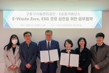 구로구시설관리공단(이사장 송인호)은 지난 11월 13일 공단본부 3층 회의실에서 기후에너지환경부 인가 비영리 공익법인 E-순환거버넌스와 함께 ‘폐전자제품 자원순환 프로젝트’ 업무협약(MOU)을 체결했다.