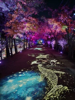 설치된 조명은 △가을 단풍잎이 흩날리는 ‘단풍길’ △연잎 위를 걷는 듯한 ‘물 위를 걷다’ △화사한 개나리가 수놓인 ‘개나리 꽃길’ △푸른 물결 속 고래가 유영하는 ‘밤하늘을 유영하는 고래’ 등 총 4가지 주제(테마)로 꾸며져 다양한 분위기를 즐길 수 있다.