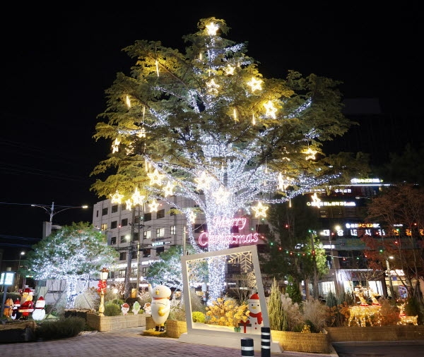 이번 성탄 트리는 구청 앞 가장 큰 나무에 조명을 설치한 것이 특징이다. 풍성한 전구 장식과 함께 멀리서도 눈에 띄는 화려한 조명이 연말 분위기를 자아냈다. 트리 앞에는 사진 촬영 공간도 마련해 누구나 자유롭게 기념사진을 남길 수 있도록 했다.