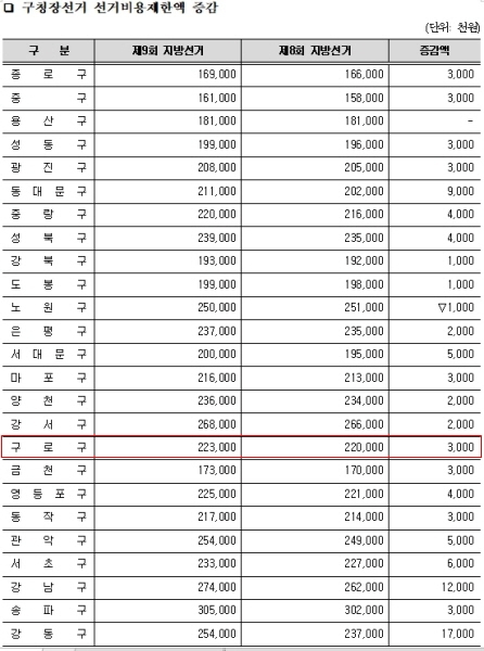 구로구청장선거의 선거비용제한액은 2억2천300만 원으로, 제8회 전국동시지방선거 대비 3천만 원 증가했다.
