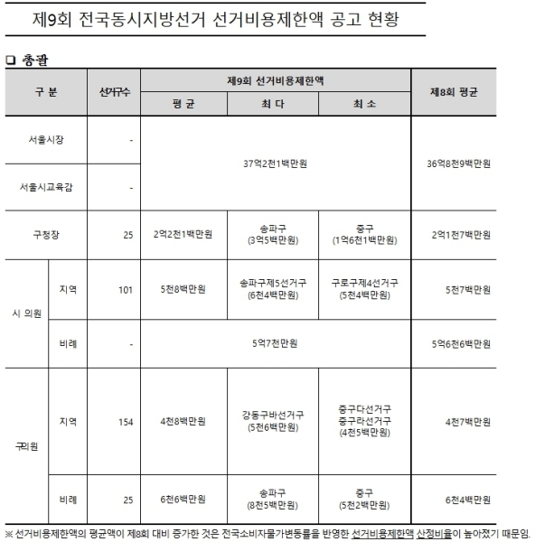서울특별시선거관리위원회(이하 ‘서울시선관위’)는 6월 3일 실시하는 제9회 전국동시지방선거에서 후보자가 선거운동을 위하여 지출할 수 있는 비용의 한도액(이하 ‘선거비용제한액’)을 공고했다.