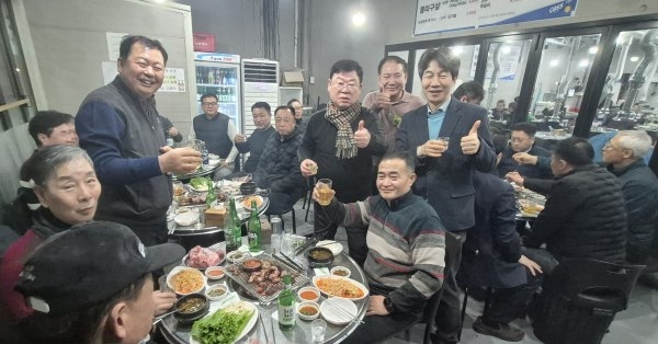 ▲구로발전협의회는 지난 1월 28일 신도림동에 위치한 음식점 ‘석구네 주먹구이’에서 2026년 정기총회를 개최하고, 올해 활동 방향과 지역사회 공헌 방안 등 논의했다. <회원들이 방문한 윤건영 국회의원과 기념촬영을 하고 있다>