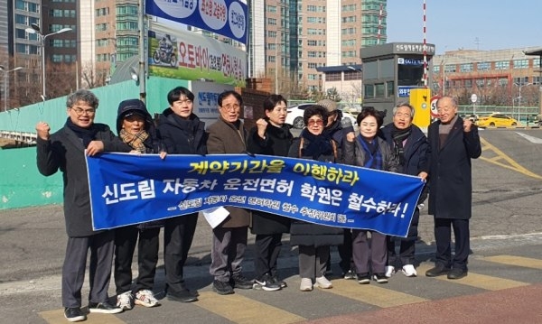 ▲ ‘신도림 자동차 운전면허 학원 철수 추진위원회’ 회원 10여명은 지난 1월 30일 구로구 신도림로 19길 68에 위치한 신도림 자동차 운전면허학원 앞에서 철수를 요구하며 집회를 가졌다.