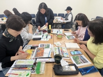 ▲ 구로구 상반기 평생학습 프로그램 수업에서 수강생들이 수채화 기법을 활용해 작품을 완성하고 있다.