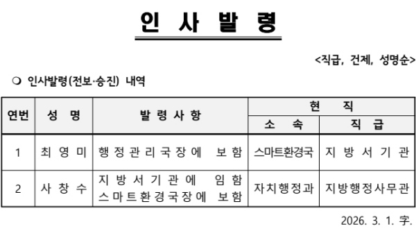 전보(4급) : 1명 △최영미 스마트환경국장(지방서기관) → 행정관리국장