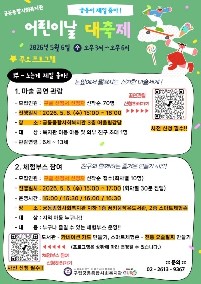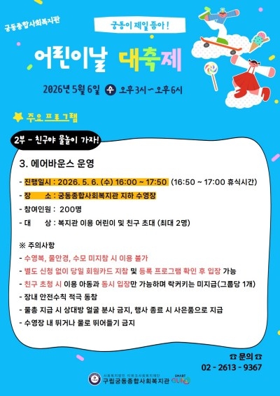 먼저 어린이날을 맞아 5월 6일(수) ‘궁동이 제일 좋아!’ 행사를 개최한다. 이날 아이들을 위한 마술공연과 체험부스, 수영장 에어바운스 물놀이 등 다양한 참여 프로그램이 진행될 예정이다.