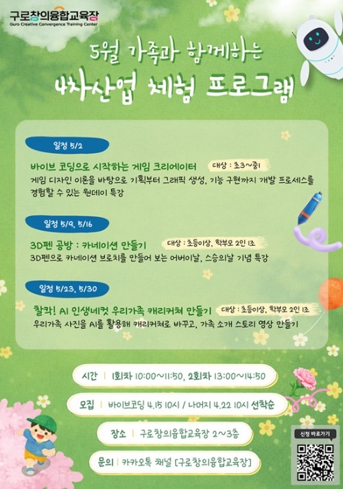 참여 신청은 구로창의융합교육장 누리집에서 선착순으로 접수하며, 프로그램별 운영 일정과 신청 기간 등 자세한 사항도 함께 확인할 수 있다.