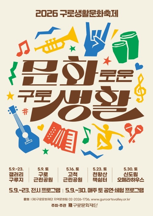 2026 구로생활문화축제‘문화로운 구로생활’에 대한 자세한 내용은 구로문화재단 홈페이지(www.guroartsvalley.or.kr)에서 확인할 수 있으며, 관련 문의는 구로문화재단 지역문화팀(02-2026-1736)으로 하면 된다. <채홍길 기자>