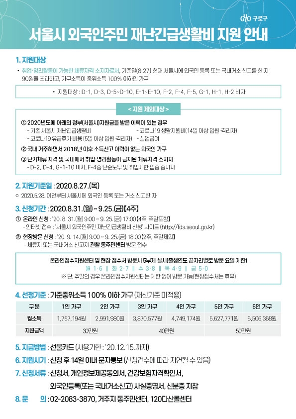 지원대상은 8월27일 현재 서울시에 외국인 등록 또는 국내거소 신고를 한 지 90일을 초과하고 가구소득이 중위소득 100% 이하이며, 취업.영리활동이 가능한 가구다.