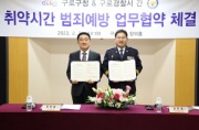 구청-구로경찰서 ‘취약시간 범죄예방 업무협약’ 체결환경공무관 공무 중 치안사건-교통사고 발견시 통보 구로구가 범죄로부터 안전한 도시를 만들기 위해 구로경찰서와 적극 협력하기로 했다.구로구(구청장 문헌일)와 구로경찰서(서장 김한철)는 지난 21일 오후 2시 구청 3층 창의홀에서 ‘취약시간 범죄예방 업무협약’을 체결했다. 이날 협약식은 박영숙 청소행정과 청소운영팀장의 사회로 양 기관 참석자 소개, 협약 내용 설명, 김한철 서장과 문헌일 구청장 인사말, ...