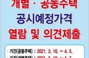 구로구가 2021년 1월 1일 기준 개별주택 공시예정 가격에 대한 열람‧의견제출 기간을 4월 7일까지 운영한다.열람대상은 공동주택을 제외한 관내 단독‧다가구‧주상복합주택 1만1,085호다. 공시예정가격은 구청 부과과, 주택 소재지 동주민센터, 부동산공시가격알리미 홈페이지(www.realtyprice.kr)에서 확인할 수 있다. 예정가격에 대해 의견이 있는 주택소유자나 기타 이해관계인은 적정 가격과 사유를 작성한 의견서를 부동산공시가격알리미 홈페이지에 제출하면 된다. ...