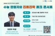 4월 2일 구청 대강당…청소년·학부모 150명 대상 무료 특강수능 만점자의 생생한 학습·진로 전략 공유, 질의응답 등 진행 구로구가 오는 4월 2일 구로구청 대강당에서 ‘2026 수능 만점자와 진로진학 토크콘서트’를 개최한다. 이번 토크콘서트는 대학수학능력시험 만점자의 실제 경험을 바탕으로 효과적인 학습 방법과 진로·진학 전략을 공유하고, 청소년과 학부모의 궁금증을 해소하기 위해 마련됐다. 강연자로는 2026학년도 대학수학능력시험 만점자인 최장우 학생(서...