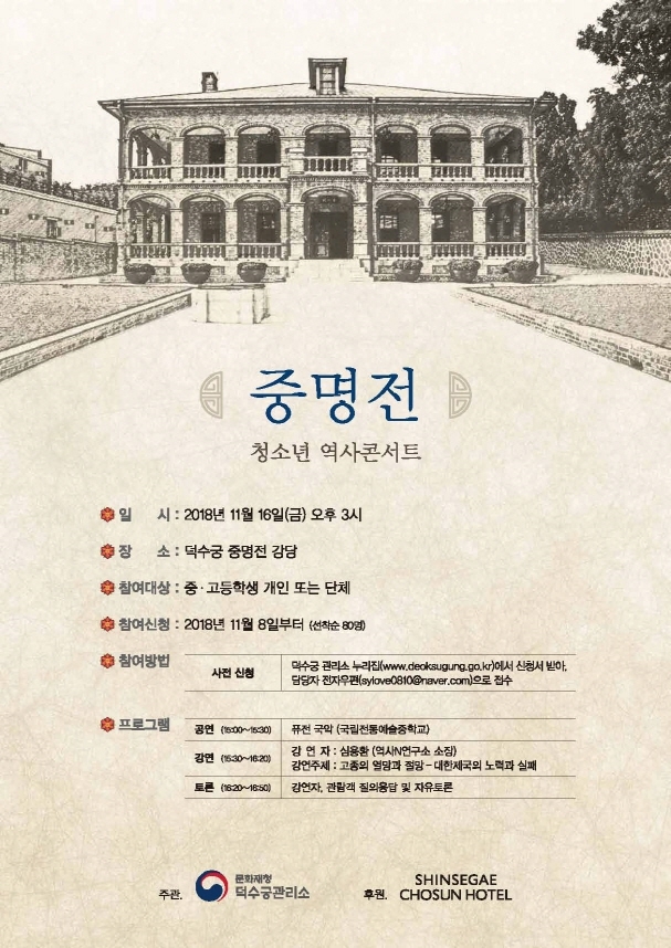 문화재청 덕수궁관리소(소장 오성환)는 청소년의 눈높이에 맞는 근현대사 교육 프로그램으로 ‘중명전 청소년 역사콘서트’를 오는 16일 오후 3시부터 개최한다.