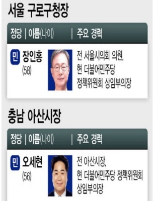충남 아산시장 선거는 오세현 민주당 후보가 당선됐고, 경남 거제시장 선거는 변광용 민주당 후보가 승리했다.