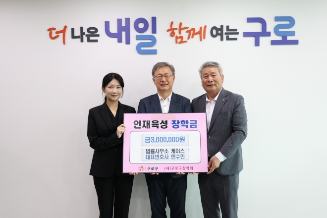 이날 전달식에는 장인홍 구로구청장을 비롯해 김홍수 (재)구로구장학회 이사장과 장학금 기탁자인 법률사무소 케이스의 현수민 대표변호사가 참석했다.