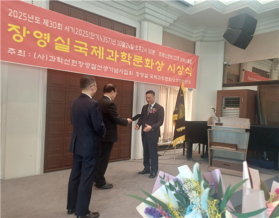 ▲ 권종달 ㈜디앤더블유그룹 회장이 ‘2025 대한민국 장영실상 국제과학문화상’ 대상을 수상하고 있다.
