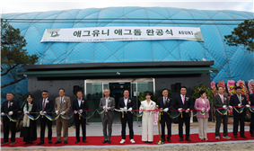 ▲ 경기도 화성시 ‘에어돔스마트팜 실증단지’ 전경.  ▲ 디앤더블유그룹과 애그유니 관계자들이 완공식 후 기념촬영을 하고 있다.