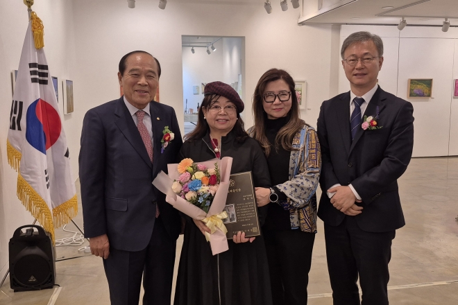 ▲제34회 구로미술전 개막식에서 류숙길 고문이 ‘구로예술인상’ 상패을 이계명 구로문화원장으로부터 받고 기념촬영을 하고 있다. <사진 왼쪽부터 이계명 문화원장, 류숙길 고문, 서경애 회장, 장인홍 구청장>