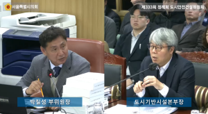 ▲박칠성 서울시의원(왼쪽)이 지난 12일 열린 제333회 정례회 도시안전건설위원회 소관 행정사무감사에서 월드컵대교 건설공사의 사업 목적 왜곡과 서부간선도로 사업의 혈세 낭비 문제를 강력히 지적했다.