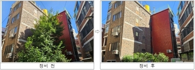 ▲구로구가 생활공간과 공공건축물 주변의 위험수목 정비를 마무리했다. <사진은 주택가 내 위험수목 정비 전후 모습>