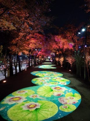 설치된 조명은 △가을 단풍잎이 흩날리는 ‘단풍길’ △연잎 위를 걷는 듯한 ‘물 위를 걷다’ △화사한 개나리가 수놓인 ‘개나리 꽃길’ △푸른 물결 속 고래가 유영하는 ‘밤하늘을 유영하는 고래’ 등 총 4가지 주제(테마)로 꾸며져 다양한 분위기를 즐길 수 있다.