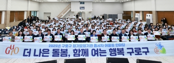 ▲구로구가 올해부터 관내 장기요양기관에 종사 중인 요양보호사를 대상으로 보수교육비를 지원한다. <사진은 장기요양기관 종사자 어울림 한마당’ 참석자들이 기념촬영을 하고 있다>
