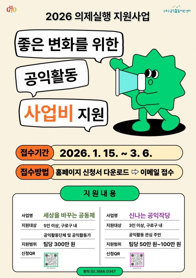 이번 사업은 ‘좋은 변화를 위한 공익활동 사업비 지원’을 목표로, 구로구 내 공익활동단체와 공익활동가의 자발적이고 지속 가능한 활동을 뒷받침하기 위해 마련됐다. 접수 기간은 2026년 1월 15일부터 3월 6일까지다.