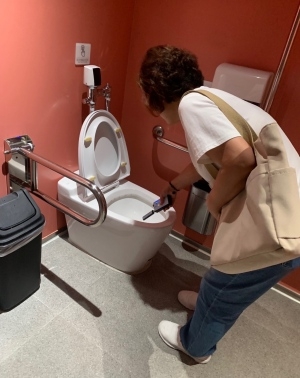 ▲ 불법촬영 시민감시단이 탐지기를 사용해 불법촬영 기기 설치 여부를 확인하고 있다.
