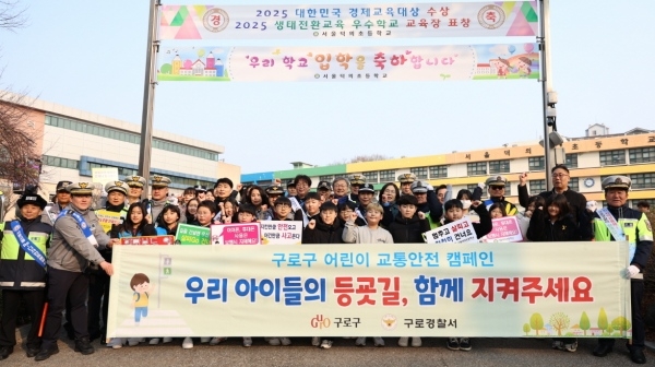 구로구가 9일 오전 서울덕의초등학교(고척로 213) 일대에서 어린이 교통사고 예방과 어린이보호구역 내 교통안전 의식 제고를 위한 '등굣길 어린이 교통안전 캠페인'을 실시했다.