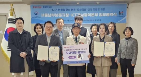 국가보훈부 서울남부보훈지청(지청장 염정림)은 지난 3월 17일오후 2시 서울남부보훈지청 4층 유일한홀에서 KT강남광역본부(본부장 김영호)와 6·25참전유공자의 안전한 일상 지원을 위한‘AI 기반 영웅 안심버튼 도와줘링 설치 지원’업무협약을 체결했다고 밝혔다.