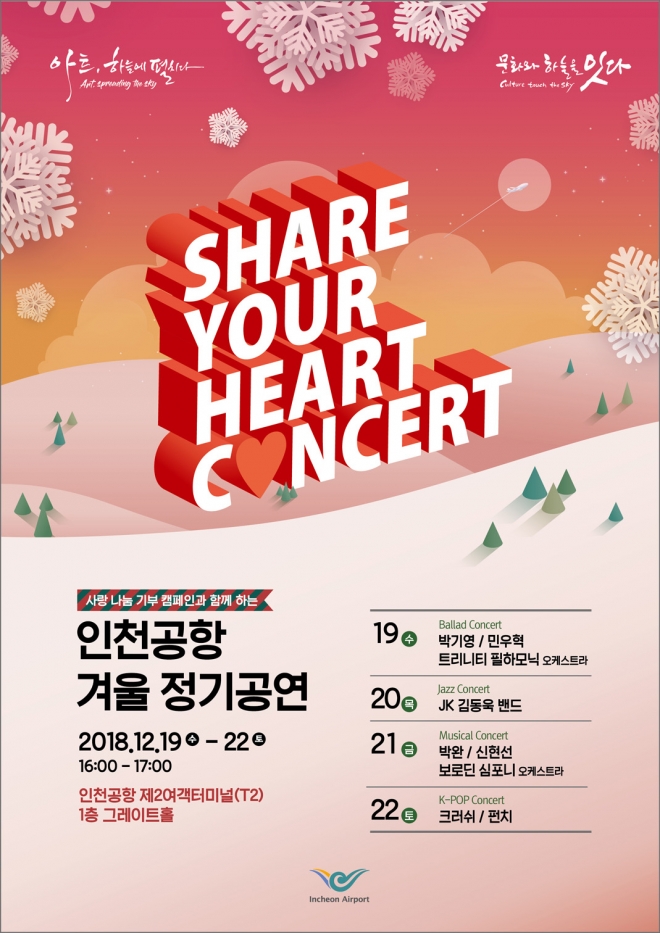 인천국제공항(사장 정일영)이 연말을 맞아 추운 겨울을 따뜻하게 만들어 줄 겨울 정기공연 ‘SHARE YOUR HEART CONCERT’를 19일부터 22일까지 4일 간 제2여객터미널 1층 그레이트홀에서 개최한다. 이번 정기공연에서는 특히 인천공항의 ‘동전모아 사랑 나눔 기부 캠페인’과 연계, 공항 이용객과 인천공항공사를 비롯한 상주기관·업체의 참여로 모금된 기부금을 어려운 이웃들을 위해 전달하는 뜻 깊은 자리도 마련될 예정이다. 공연 첫날 19일(수)에는 국내 정상급 민간 교향악단 ‘트리니티 필하모닉 오케스트라’와 MBC 복면가왕 출연 등 활발한 방송활동을 이어가고 있는 가요계 디바 ‘박기영’, 뮤지컬, 방송 등에서 뛰어난 연기와 노래실력으로 큰 인기를 끌고있는 실력파 뮤지컬배우 ‘민우혁’의 감미로운 ‘발라드 콘서트’가 펼쳐진다. 둘째 날 20일(목)에는 대한민국 대표 남성 보컬리스트 ‘JK 김동욱 밴드’의 ‘재즈 콘서트’를 선보인다. JK 김동욱은 tvN 오페라 스타, MBC 나는가수다, KBS2 불후의 명곡-전설을 노래하다 등 다양한 방송활동과 많은 히트곡으로 대중의 사랑을 받고 있는 국내 남성들의 워너비 가수다. 셋째 날 21일(금)에는 실력파 팝페라 테너 ‘박완’과 베테랑 메조소프라노 ‘신현선’, 언론의 극찬을 받은 ‘보로딘 심포니 오케스트라’가 뮤지컬과 오페라, 팝이 하나가 된 특별한 공연 ‘뮤지컬 콘서트’를 무대에 올려 인천공항을 찾은 여행객들의 눈과 귀를 사로잡는다. 마지막 날 22일(토)에는 국내외에서 뜨거운 사랑을 받으며 최근 미국투어 콘서트를 마친 가수 ‘크러쉬’, OST 요정이라 불리며 인기 급상승중인 가수 ‘펀치’가 선보이는 따뜻한 감성의 ‘K-POP 콘서트’가 인천공항을 뜨겁게 달구며, 올해 마지막 정기공연을 화려한 감동의 무대로 마무리한다. 공연기간을 포함해 12월 1일부터 25일까지 진행되는 동전모아 사랑 나눔 기부 캠페인은 2터미널 공연장과 인천공항 곳곳에 위치한 모금함을 통해 참여할 수 있으며, 참여자에게는 소정의 기념품과 행운권 등이 증정된다. 정기공연 첫날인 19일 공연에 앞서 인천공항공사의 기부금 전달식이 개최되며, 캠페인 전 기간 모금된 기부금은 장애아동과 의료취약계층의 재활치료를 지원하는 대한적십자사의 ‘Happy Move’ 프로그램에 사용될 예정이다. 이번 정기공연은 19일부터 22일까지 매일 오후 4시부터 1시간 동안 진행되며, 공항을 찾은 방문객 누구나 무료로 감상할 수 있다. 인천공항 홈페이지와 아트포트 홈페이지를 통해 선착순으로 무료 좌석예약을 신청 받는다. 자세한 사항은 해당 홈페이지 또는 제2여객터미널 문화예술사무국을 통해 확인할 수 있다. 정일영 인천국제공항공사 사장은 “이번 겨울 정기공연은 인천공항에서 가슴 따뜻한 연말을 위해 진행 중인 기부 캠페인과 연계해 소외계층과 더불어 사회적 가치를 공유하기 위한 특별행사”라며 “인천공항을 찾은 방문객들이 세계적인 아티스트들의 예술공연을 즐기고 어려운 이웃을 돕는 기부천사로 많이 동참했으면 좋겠다”고 말했다.
