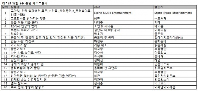 예스24 12월 2주 종합 베스트셀러를 발표했다고 13일 밝혔다.