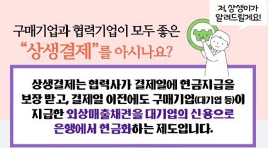 상생결제는 대금지급을 은행이 보증하는 결제시스템이다. 원청업체와 하청업체 사이에 은행이 안전망으로 연결되어 있는 구조이다. 이 때문에 원청업체가 부도가 나도 안전하게 대금을 회수 할 수 있어 연쇄부도의 위험이 높은 어음보다 안전한 결제수단이다. 대기업이 원청업체에게 지급한 금액 중 하청업체에게 내려줘야 할 금액을 은행이 대금 결제일까지 별도계좌에 안전하게 보관함으로써, 원청업체 부도에 따른 압류․가압류를 할 수 없게 되어 있다. 또한, 외상매출채권담보대출 할인 때 대기업이나 공공기관에게 적용되는 저금리를 2차, 3차 협력기업도 누릴 수 있어 현금유동성 확보에도 도움이 된다.