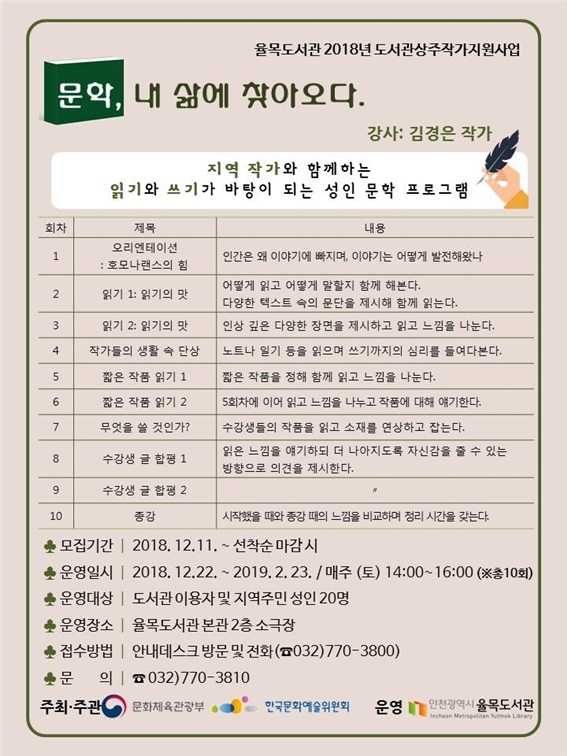 인천광역시가 설립하고 인천광역시도서관발전진흥원이 운영하는 율목도서관(관장 김태경)은 문화체육관광부가 주최하고 한국문화예술위원회가 주관하는 ‘2018년 도서관 상주작가 지원사업’에 선정되었다.