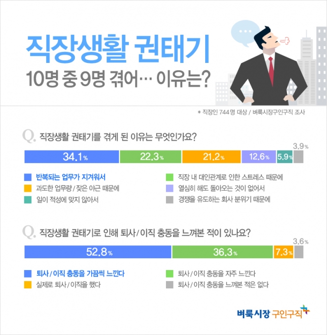 우리나라 직장인 10명 중 9명은 직장생활 권태기를 겪고 있는 것으로 나타났다.