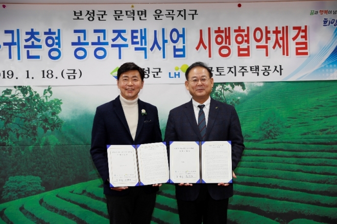 전남 보성군(김철우 군수)과 한국토지주택공사(이하 LH)는 18일 보성군청에서 ‘귀농·귀촌형 공공주택사업’ 시행협약을 체결했다.