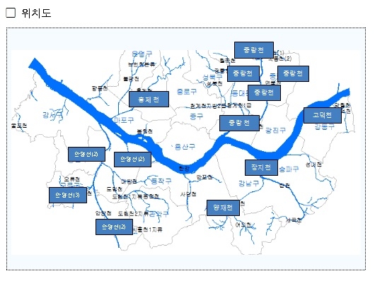 ○ 중랑천변 5개 자치구(성동구, 중랑구 등)는 사면·둔치녹화 및 초화원 등을, 안양천변 4개 구(구로구, 양천구 등)는 테마공원 및 장미원 정비, 강동구 고덕천은 사면 숲 조성 등을 조성할 계획이다.