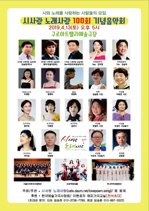 구로구 구로아트벨리예술극장 대극장(2층)에서 오는 4월 13일(토) 오후 5시부터 시낭송과 가곡의 향연이 펼쳐진다.