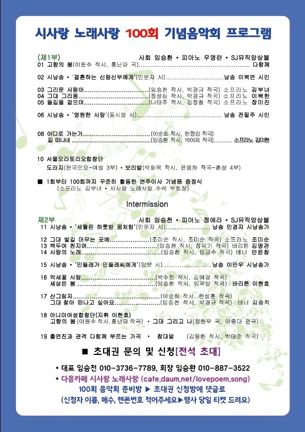 이 행사는 '시시랑 노래사랑'에서 주최하며, 매달 첫째 토요일 5시에 정기적으로 개최되지만 이번은 제100회를 기록하는 특별한 의미가 있다.