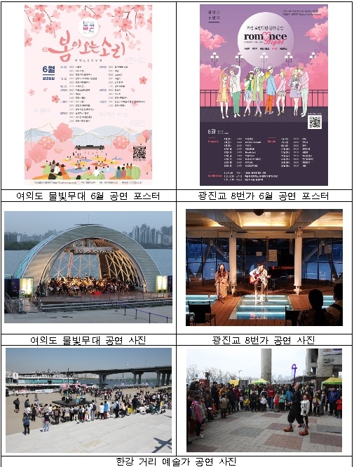 주요 공연 장소는 △여의도(여의나루역 계단, 물빛광장, 서강대교하부, 이랜드크루즈 앞) △반포(물방울놀이터, 서래섬) △망원(서울함공원, 초록길) △뚝섬(장미원, 수변무대 강변, 유람선선착장) 등이다.