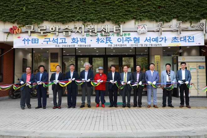 구로오늘신문과 서울오늘신문이 2019년 더불어서 함께 살기운동 계획의 하나로 행사한 ‘한국 짝 맺어주기 운동본부’ 창립 후원 죽전(竹田) 구석고 화백-송민(松民) 이주형 서예가의 ‘2인 전시회’가 지난 2일부터 6일까지 갤러리 구루지(구로구민회관 옆)에서 성황리에 열렸다.