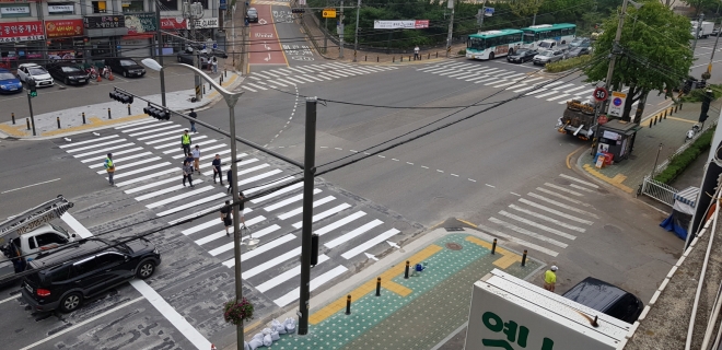이 교차로는 ‘ㄷ자’로 횡단보도가 설치돼 있어 무단횡단에 의한 교통사고가 종종 발생하는 지역이었다. 이번 사업을 통해 횡단보도 1면이 추가돼 인근 횡단보도의 형태가 ‘ㅁ자’로 탈바꿈하며 안전성과 편리성이 강화됐다.