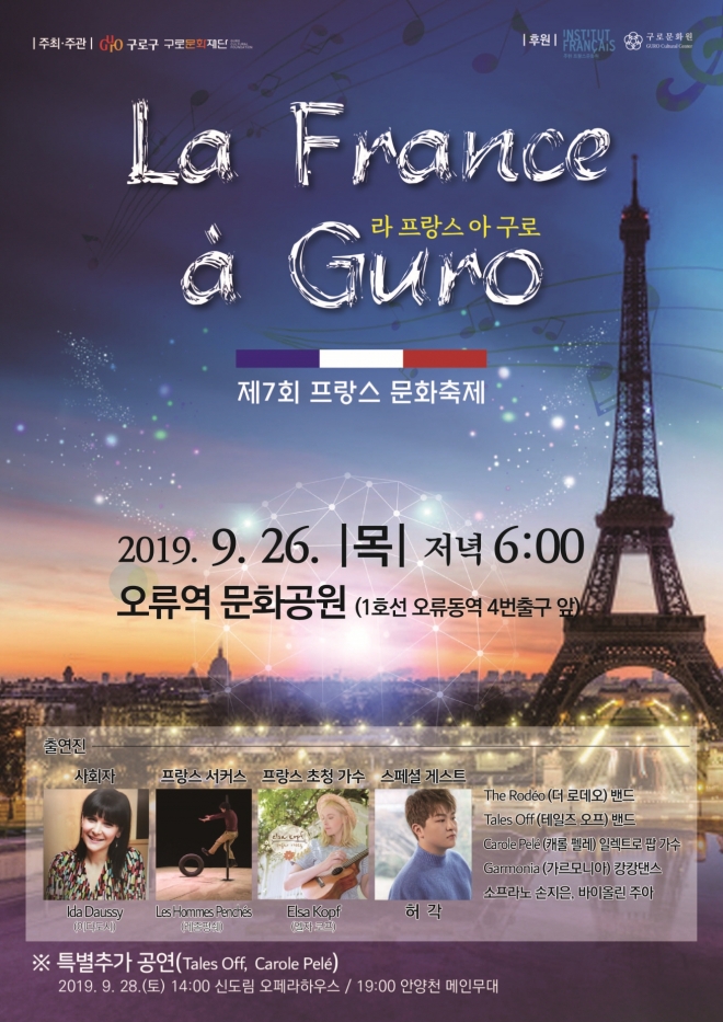 ‘프랑스 가을 음악제’는 오류동역 4번 출구에 위치한 오류역 문화공원 특설 야외무대에서 오후 6시 30분부터 3시간 동안 펼쳐진다. 프랑스 출신 방송인 이다도시씨가 사회를 맡고 프랑스 현지에서 온 아티스트들이 공연에 참가한다.