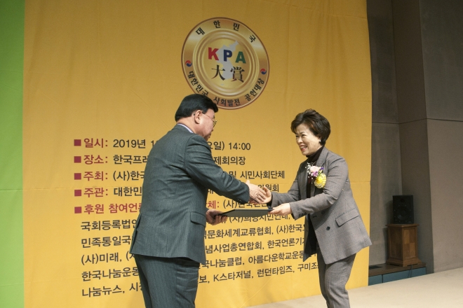 구로구의회 노경숙 의원이 지난 27일 한국프레스센터 국제회의장에서 (사)한국언론사협회 주최로 개최된 ‘2019 대한민국사회발전공헌 대상’시상식에서 지방의회의정활동부문 최우수상을 수상했다.